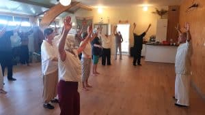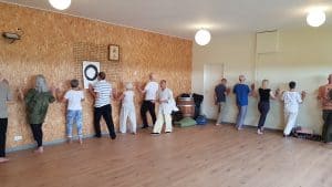 Elke dag starten we met warming up oefeningen met als doel het openen van het lichaam. Het lichaam bevat diverse poorten die je kan gebruiken om chi te verzamelen, af te voeren en in beweging te brengen. Een combinatie van wiegend bewegen, van voor naar achter en op zij, ademen en het zover mogelijk strekken zorgt voor een interne activering van het lichaam die geweldig is. Je kan het openen en de activering van de interne energiebanen voelen. Je krijgt het warm, hebt zin om te springen en voelt je 5 centimeter groter.